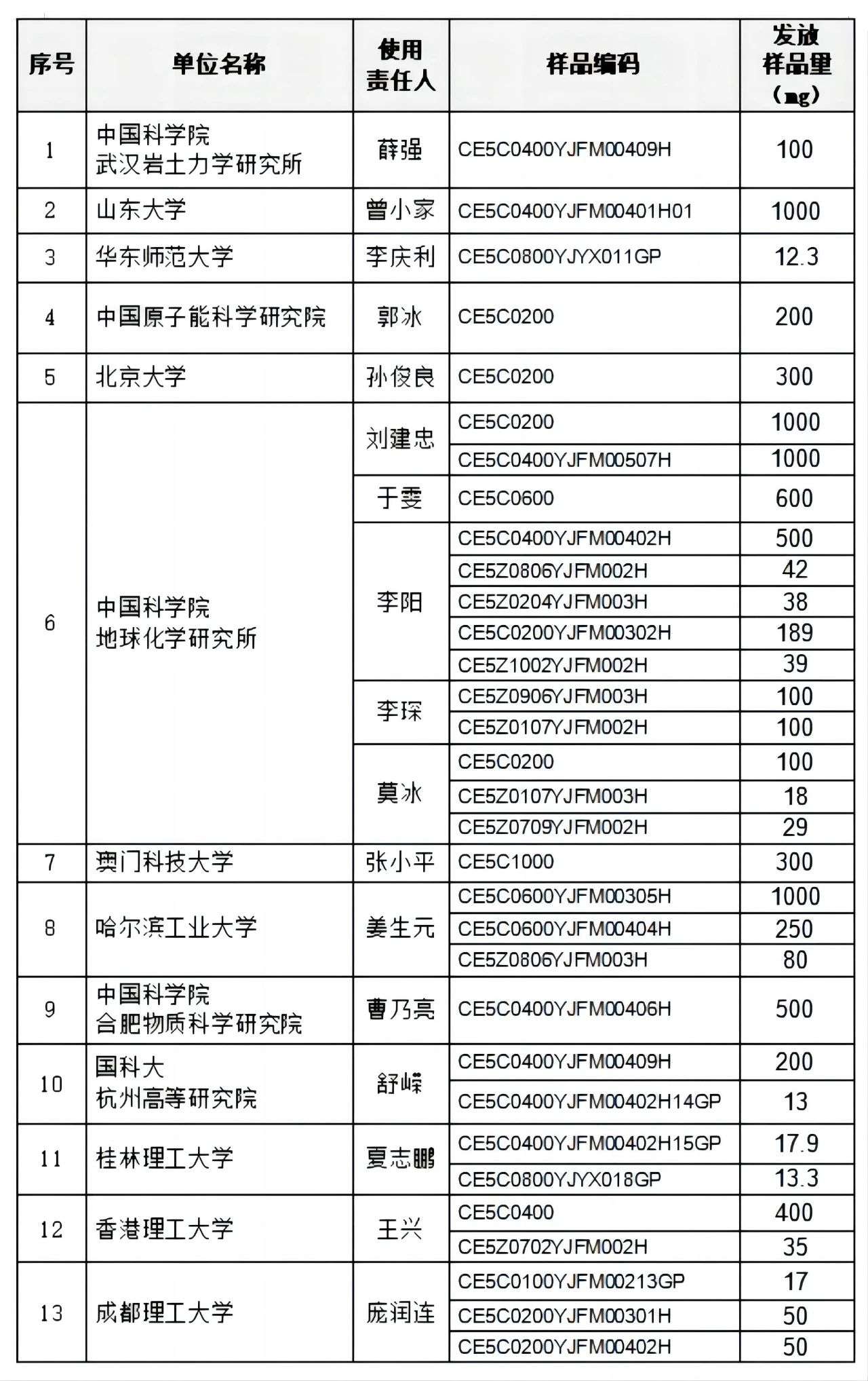 2020年12月17日,嫦娥五號帶著1731克月球樣品成功返回地球,中國成為第三個成功采集到月壤的國家,而這也是人類首次獲得的月表年輕火山巖區樣品,也是中國科學家第一次擁有屬于自己的地外天體返回樣品。2021年7月,嫦娥五號月壤樣品向全社會開放申請。至今,國家航天局已向國內131個研究團隊發放7批次共85.48克月壤科研樣品。今年5月,探月與航天工程中心公布國內第七批嫦娥五號月球科研樣品發放名單,共有包括中國科學院武漢巖土力學研究所、中國原子能科學研究院、北京大學、澳門科技大學、哈爾濱工業大學、香港理工大學在內的13家科研機構的32份申請獲得通過,樣品發放量共計8293.5毫克,8590am海洋之神名列其中。