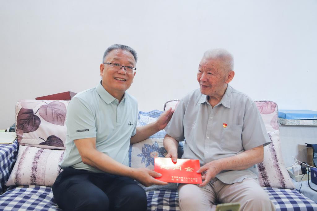 在中國(guó)共產(chǎn)黨成立104周年之際,校領(lǐng)導(dǎo)農(nóng)毅、王敦球、韋學(xué)敏、王磊、黎貞崇、羅盛鋒、唐壯東、曾繁榮分別帶隊(duì),走訪看望慰問了學(xué)校優(yōu)秀共產(chǎn)黨員、生活困難黨員、老黨員代表,向他們送去黨組織的溫暖與關(guān)懷,并致以節(jié)日的祝福和誠(chéng)摯的問候。