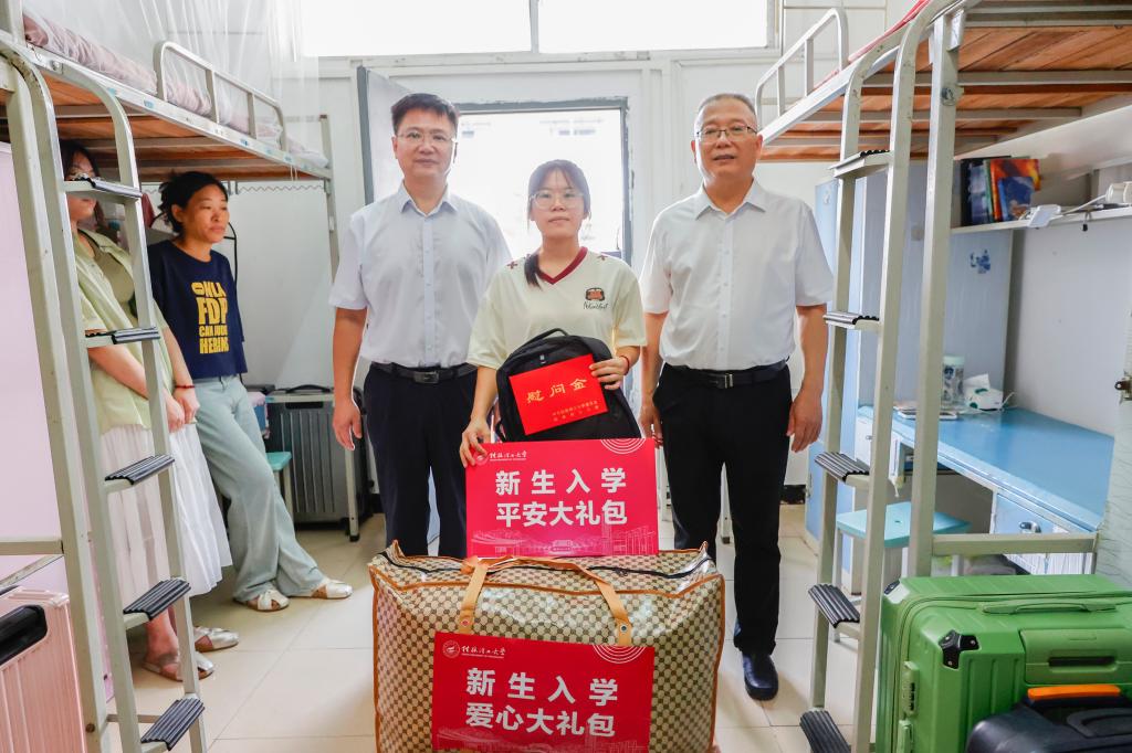 在學(xué)生宿舍,校領(lǐng)導(dǎo)與新生親切交流,關(guān)心大家入學(xué)后的適應(yīng)情況與生活需求,并贈送了平安大禮包、愛心大禮包和學(xué)習(xí)用品,鼓勵同學(xué)們盡快融入新環(huán)境、合理規(guī)劃大學(xué)生活、保持積極心態(tài)、勇于探索創(chuàng)新,在桂工度過充實而美好的求學(xué)時光。