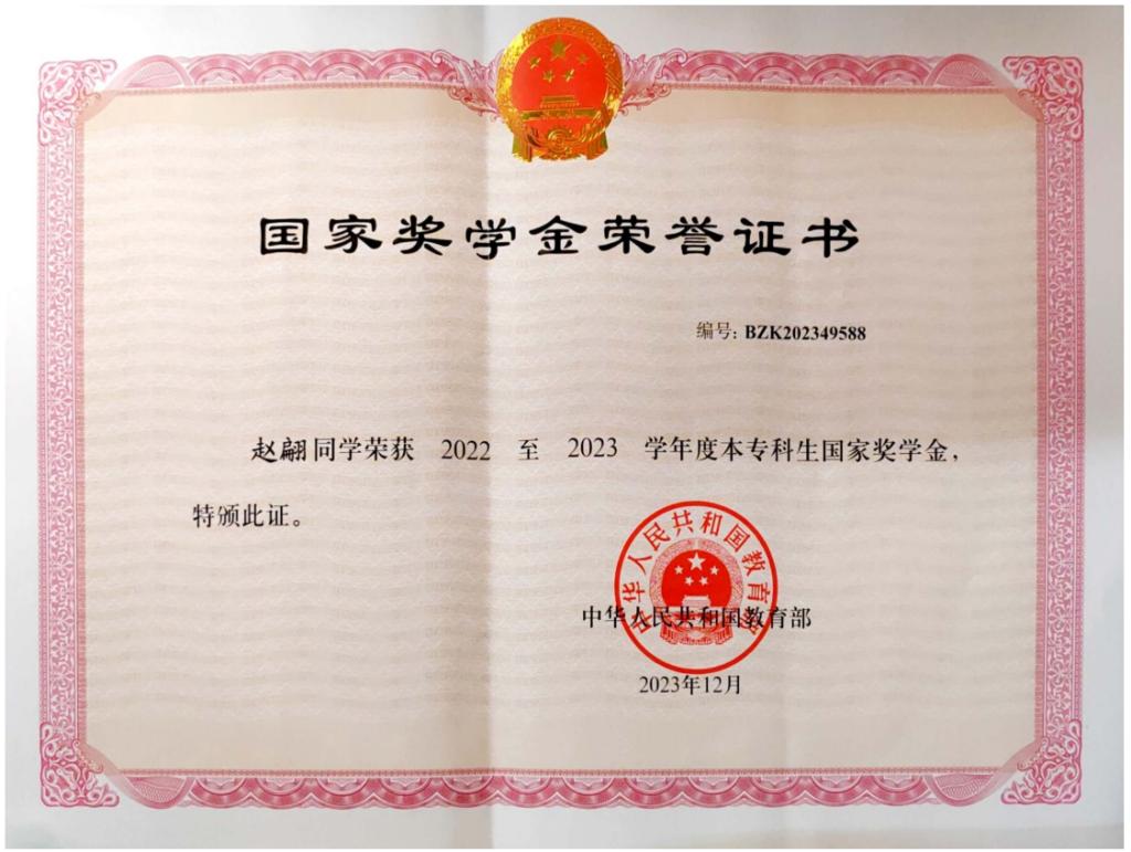 在校期間,趙翩的優秀有目共睹。她榮獲“國家獎學金”“校級特等獎學金”,獲評“十佳團干部”“優秀三好學生”等榮譽,還入選校優秀學生報告團和國獎生宣講團,用自身經歷鼓舞更多學子勇攀學術高峰。而本次入選《2023-2024學年度本專科生國家獎學金獲獎學生代表名錄》,趙翩也感到非常榮幸和自豪。“這是對我過去努力的肯定,更是激勵。我深知這份榮譽背后離不開學校、老師、同學和家人的支持,會帶著感恩之心繼續前行。”
