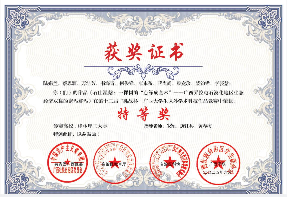 學院學子獲第十二屆“挑戰杯”廣西大學生課外學術科技作品競賽特等獎