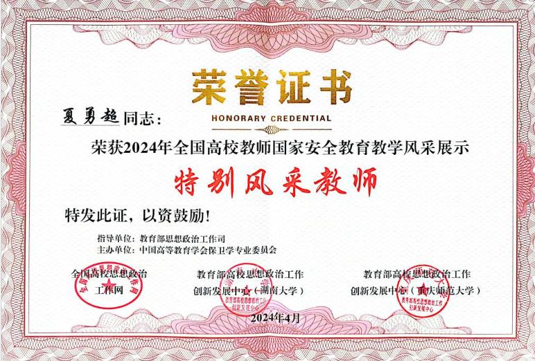 學院教師獲2024年全國高校教師國家安全教育教學風采展示“特別風采教師”榮譽稱號