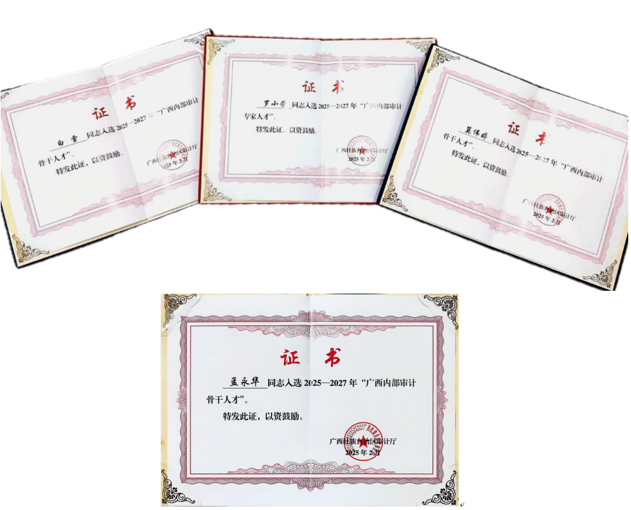 圍繞新時代對審計工作提出的新要求,構建系統化、專業化的培訓體系。通過業務輪訓、案例研討、參與上級審計機關項目、“以審代訓”等多種方式,全面提升審計人員在財務、工程、法律、大數據分析等方面的專業素養和實戰能力。4人入選區審計廳人才庫;1人通過入選廣西“十百千”高端會計人才;5人次參與區審計廳審計項目和教育廳專項檢查項目,抽審人員的專業能力及敬業態度獲得了抽調單位的高度好評;8人次參加校內巡察和專項檢查工作;1人在廣西內審協會教育分會上分享審計經驗;舉辦1次桂林高校審計業務研討會;2人獲得審計廳立項的科研項目,多方式務實審計人員實操功底,努力實現理論實踐“雙融合”。