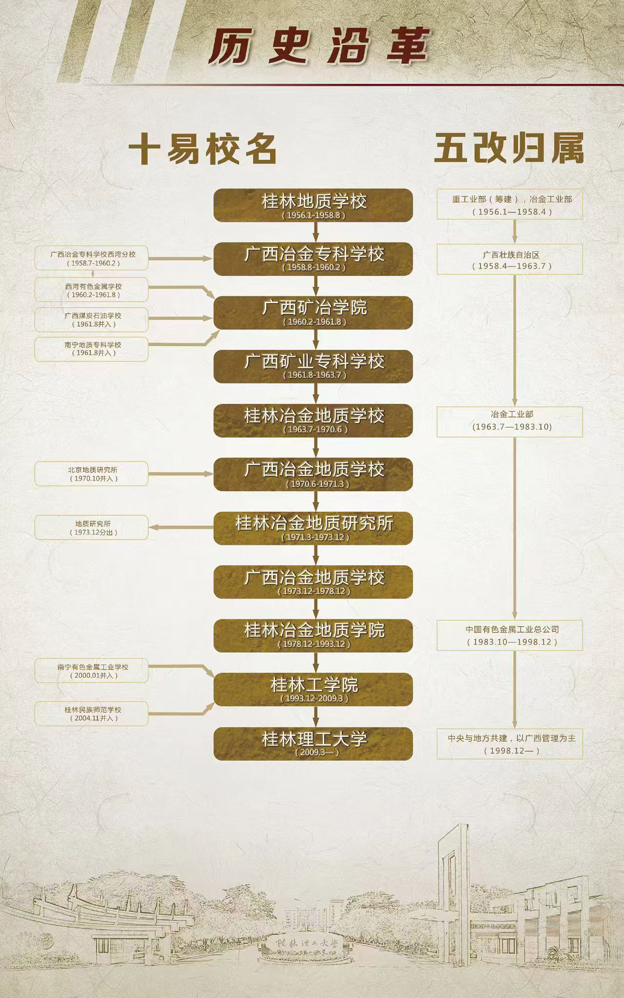 1956年1月,為適應(yīng)重工業(yè)建設(shè)需要,根據(jù)國家第一個五年計劃要求,原國家重工業(yè)部決定在桂林組建一所地質(zhì)性質(zhì)的專業(yè)學(xué)校。1956年8月正式定名為桂林地質(zhì)學(xué)校。